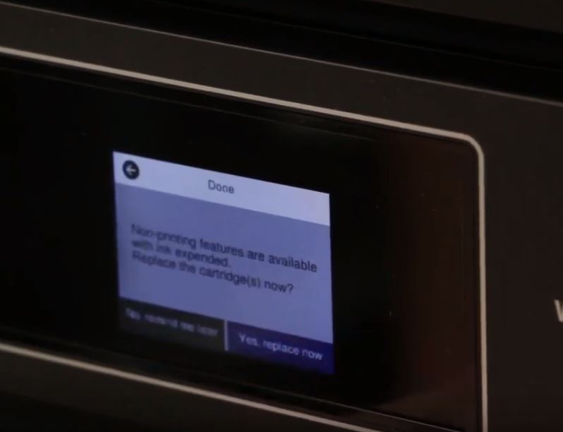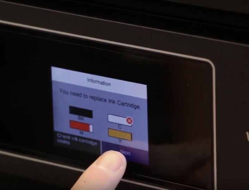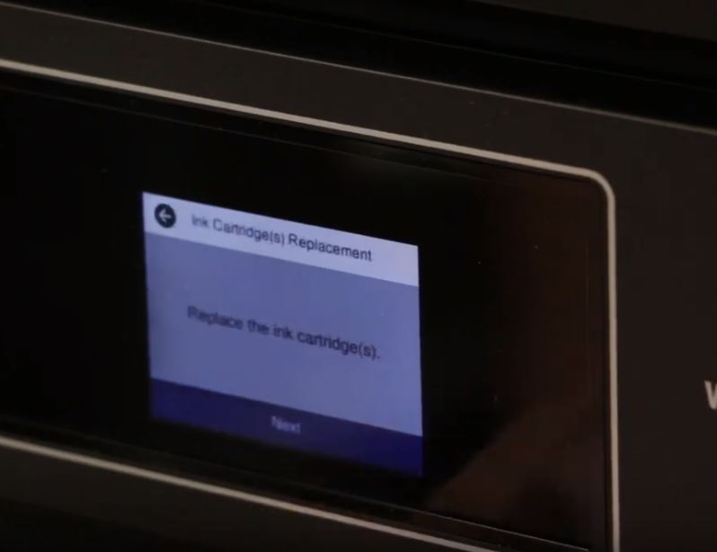 - A message will appear on your printer’s display if a cartridge needs to be replaced. To start the replacement process, select “Next”.