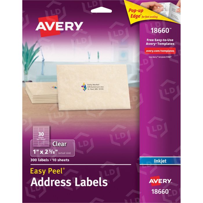 Create a professional, custom-printed look with clear labels that virtually disappear when applied to white and colored surfaces. Easy Peel feature allows you to remove labels easily from the sheet. Pop-up Edge lets you bend the letter-size sheet to expose the label edge, peel, and then fold the sheet back to flat. Avery offers many easy-to-use templates for Microsoft Word and other popular software programs. Compatible with inkjet printers.