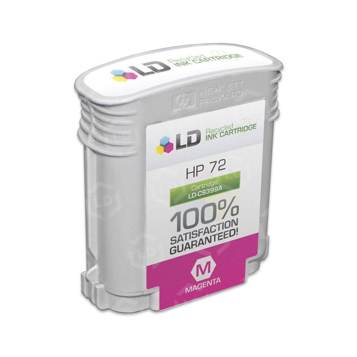 The high-quality LD remanufactured C9399A (HP 72) magenta inkjet cartridge is an OEM HP C9399A cartridge that has been professionally remanufactured using both OEM and non-OEM parts. This remanufactured LD cartridge for HP 72 comes equipped with an ink indicator chip that accurately tracks your ink levels and communicates with your printer to be sure you are receiving the best quality print possible. Our Lifetime Guarantee ensures that you will get excellent printouts when you buy our remanufactured C9399A. LD remanufactured ink cartridges are not remanufactured by HP.